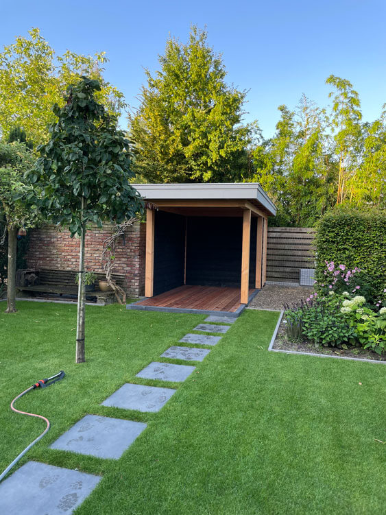 In deze tuin hebben we een veranda geplaatst als perfecte aanvulling op de buitenruimte. De vloer werd afgewerkt met luxe hardhouten vlonderplanken die een warme, natuurlijke uitstraling biedt. Het grote terras werd opgewaardeerd met strakke keramische tegels, vakkundig gevoegd voor een naadloze afwerking. De tuin is verder verrijkt met zorgvuldig geselecteerde bomen, borders, borderranden en een groen gazon. Dit zorgt voor een harmonieuze en verzorgde tuin.